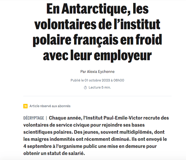 Le Monde – En Antarctique, les volontaires de l’institut polaire français en froid avec leur employeur 24/11/2023
