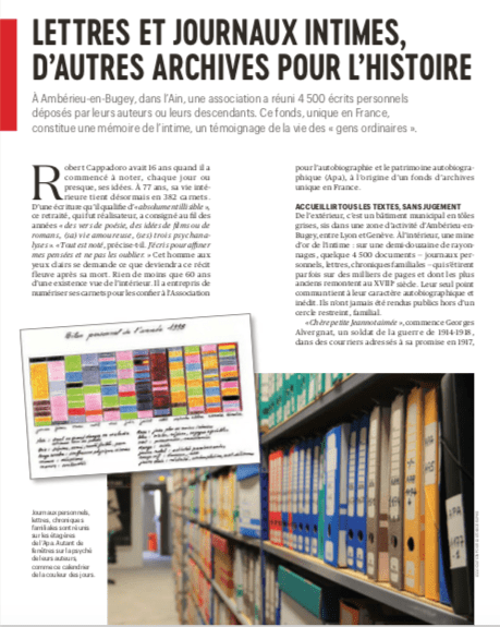 À Ambérieu-en-Bugey, dans l’Ain, une association a réuni 4 500 écrits personnels déposés par leurs auteurs ou leurs descendants. Ce fonds, unique en France, constitue une mémoire de l’intime, un témoignage de la vie des « gens ordinaires ».