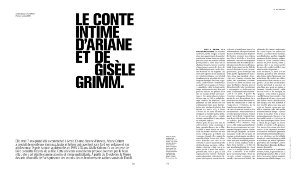 Elle avait 7 ans quand elle a commencé à écrire. En une dizaine d’années, Ariane Grimm a produit de nombreux journaux, textes et lettres qui racontent sans fard son enfance et son adolescence. Depuis sa mort accidentelle en 1985, à 18 ans, Gisèle Grimm n’a eu de cesse de faire connaître l’œuvre de sa fille. Cette ancienne comédienne n’y joue pourtant pas le beau rôle : elle y est décrite comme absente et même maltraitante.