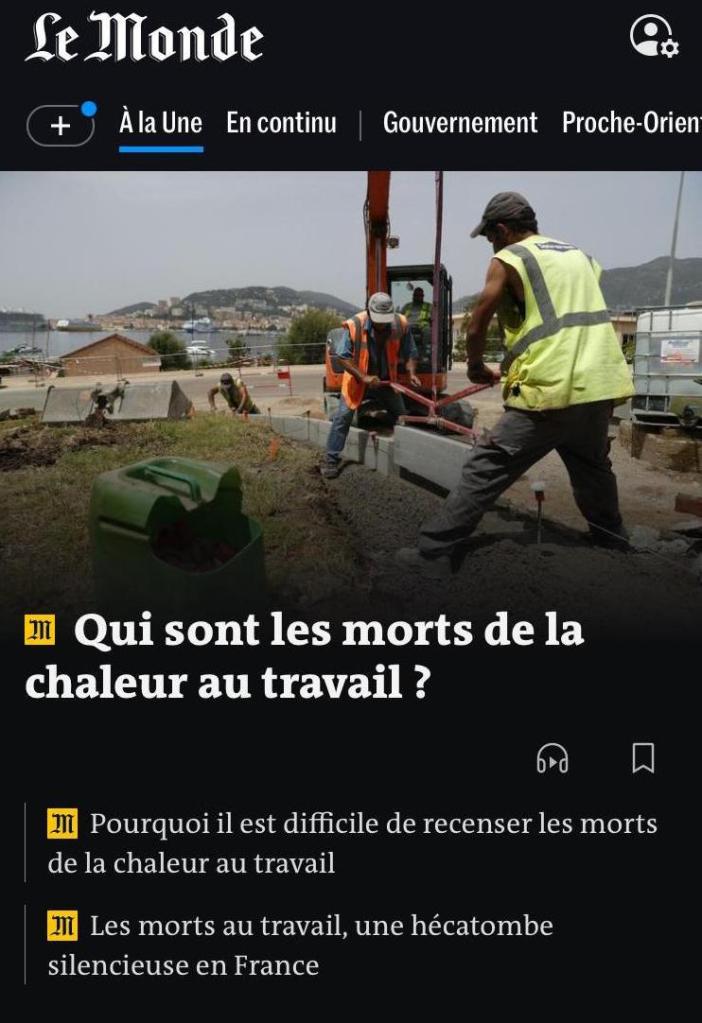 Depuis 2018, au moins 48 travailleurs sont morts dans des accidents du travail liés aux fortes chaleurs. Ouvriers du BTP, vendangeurs, intérimaires… le climat représente un nouveau risque pour des salariés de tous âges déjà soumis à des conditions de travail éprouvantes, d’après une analyse inédite de ces cas réalisée par « Le Monde ».